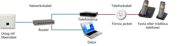 Om du använder stadsnätsuttaget till fler tjänster, som Internet och TV, behöver du en router. Det är ett slags grenuttag som ger dig fler portar att koppla in utrustning till.Du ansluter telefoniboxen till bredbandsporten i fiberboxen (LAN3). Till telefoniboxen ansluter du sedan routern som i sin tur har LAN-portar för övrig utrustning samt oftast även trådlös funktion.